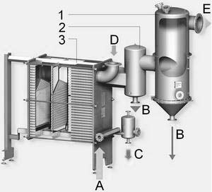 A = Product B = Concentrate C = Condensate D = Heating steam E = Vapour 1 = Main separator 2 = Pre-separator 3 = Plate calandria